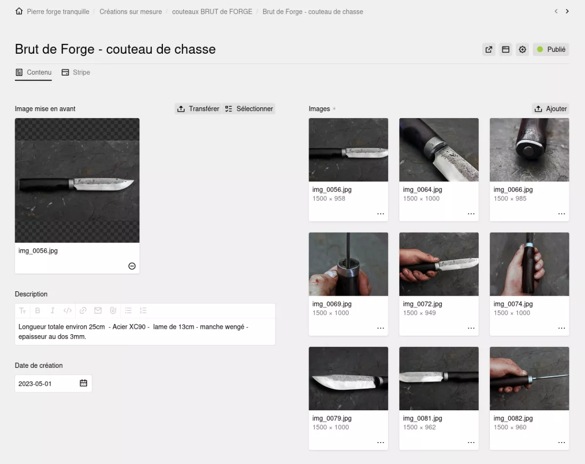 Une fois publiée, la création apparait automatiquement sur une page dédiée, mais aussi dans la liste des créations de sa catégorie. Ce fonctionnement est similaire pour les pages de stages du site.